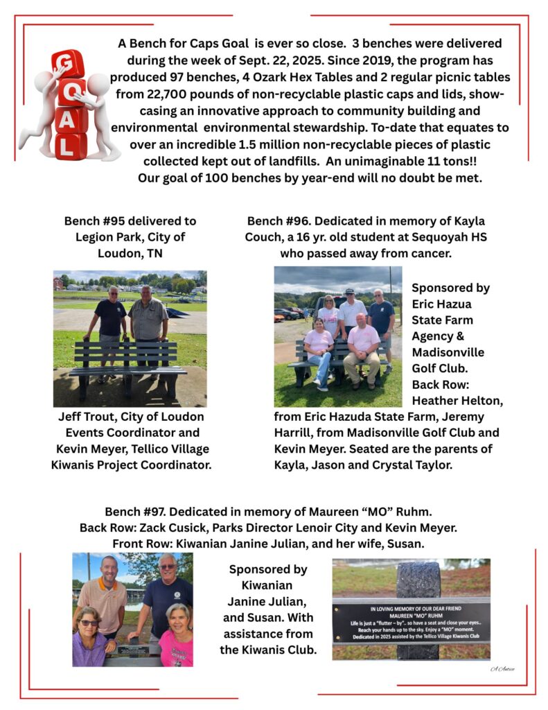 You can donate caps and lids by dropping them off at the Community Church at Tellico Village, 130 Chota Ctr. Loudon, TN. There is a Wishing Well located under the long staircase in the church lobby. Monetary donations can be sent to: Kiwanis Club of Tellico Village, PO Box 592, Loudon, TN 37774. Please note Bench Program in memo line on your check.