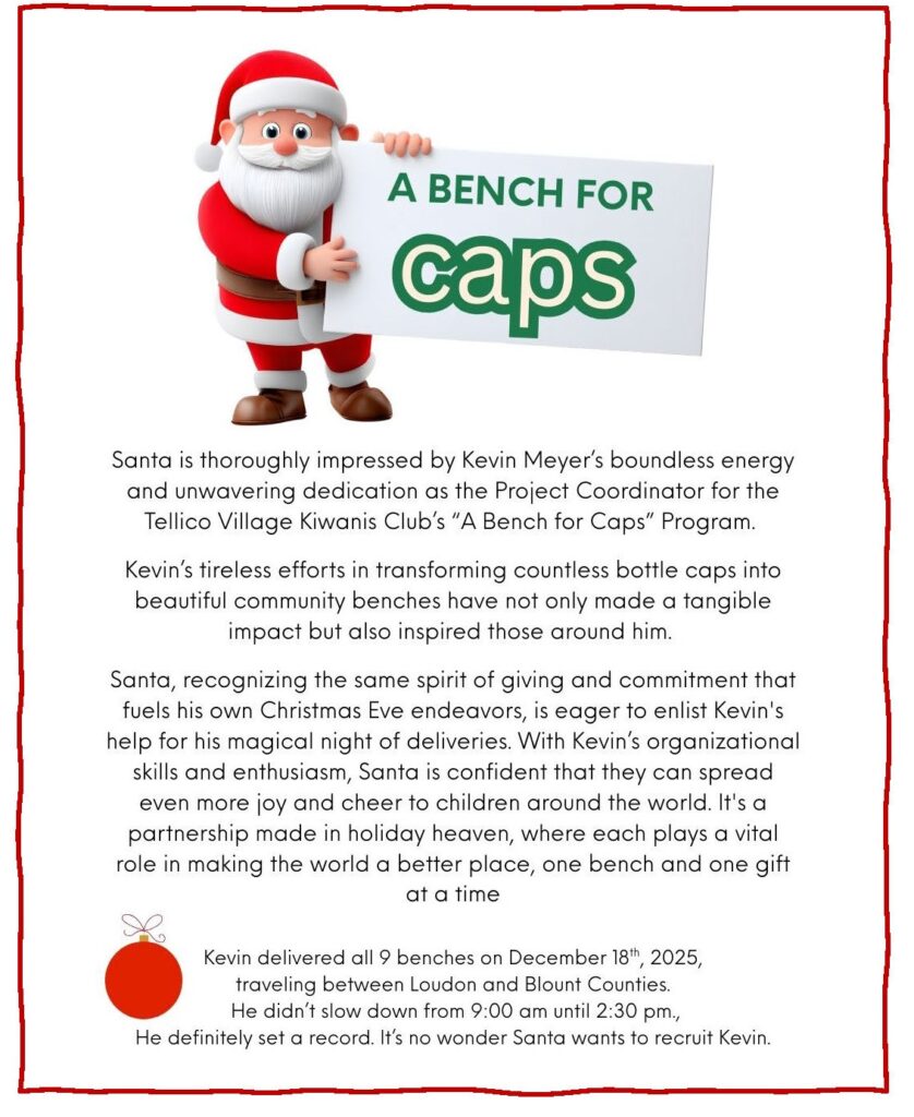 A Bench for Caps Program is environmentally conscious, repurposing non-recyclable plastic lids and bottle caps into benches and tables. Since its inception, the Tellico Village Kiwanis Club’s A Bench for Caps Program has produced 111 benches, 4 Ozark Hex Tables, and 2 regular picnic tables from 24,800 pounds of non-recyclable plastic, showcasing an innovative approach to community building and environmental stewardship.
