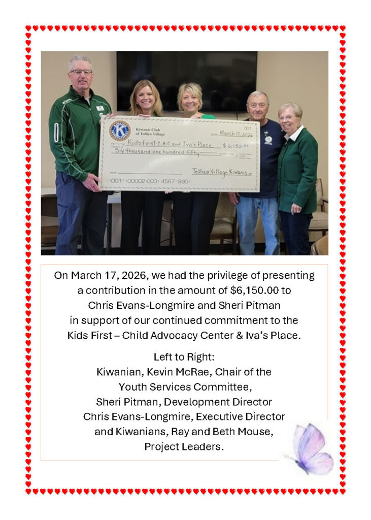 On March 17, 2026, we had the privilege of hosting Chris Evans-Longmire, the Executive Director of Kids First - Child’s Advocacy Center and Iva’s Place, as our guest speaker. She was joined by Sheri Pitman, the Development Director.