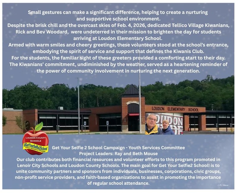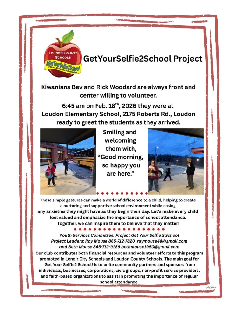 Our club contributes both financial resources and volunteer efforts to this program promoted in Lenoir City Schools and Loudon County Schools. The main goal for Get Your Selfie2 School! is to unite community partners and sponsors from individuals, businesses, corporations, civic groups, non-profit service providers, and faith-based organizations to assist in promoting the importance of regular school attendance.