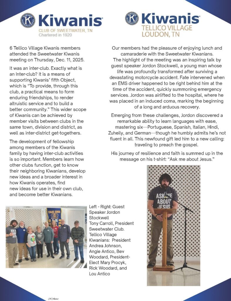 We had a great start to the New Year.  11 of our Kiwanis members attended an Inter-Club meeting on January 2, 2024 at the Maryville Kiwanis Club.  We experienced the true meaning of fellowship. We were greeted at the door! We enjoyed a great lunch. Their President, Wanda Davis, conducted an interesting and comprehensive meeting. We shared ideas, and plans to continue the work of Kiwanis. We also had the privilege to viewed Pete Davis’s new Maryville Kiwanis website. We hope you take a moment to read the short synopsis, “What is Inter-Club”.