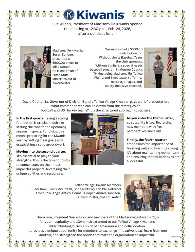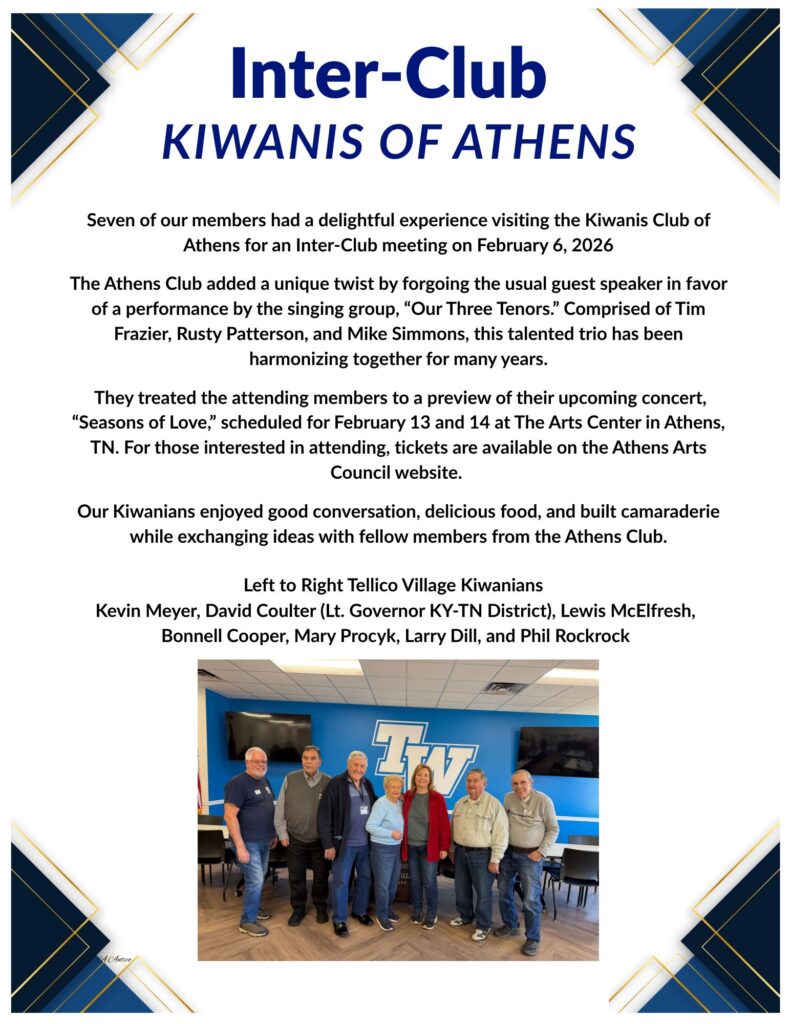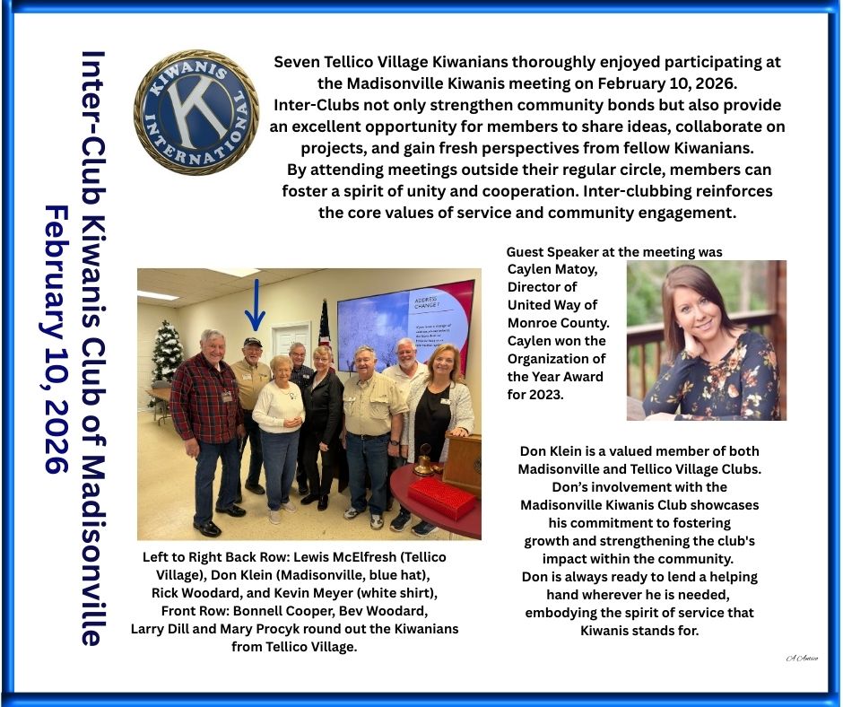 We had a great start to the New Year. 11 of our Kiwanis members attended an Inter-Club meeting on January 2, 2024 at the Maryville Kiwanis Club. We experienced the true meaning of fellowship. We were greeted at the door! We enjoyed a great lunch. Their President, Wanda Davis, conducted an interesting and comprehensive meeting. We shared ideas, and plans to continue the work of Kiwanis. We also had the privilege to viewed Pete Davis’s new Maryville Kiwanis website. We hope you take a moment to read the short synopsis, “What is Inter-Club”.