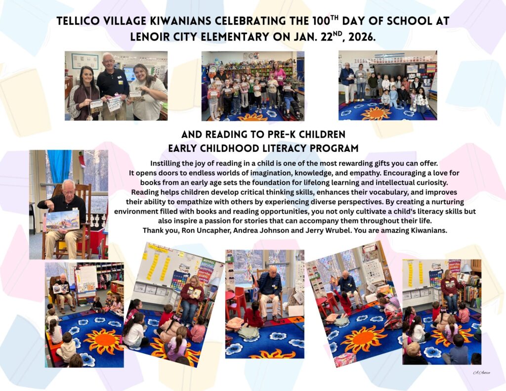 Tellico Village Kiwanians celebrated the 100th day of school at Lenoir City Elementary School on January 22nd, 2020. They also read to the Pre-K Children Early Childhood Literacy Program.