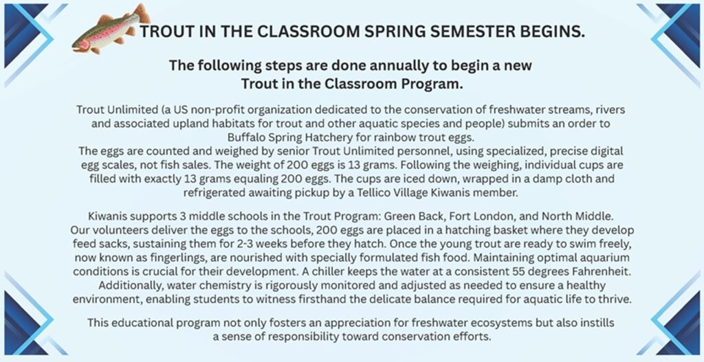 We provide financial and manpower support for this environmental education program. Students in grades K-12 raise trout from eggs to fry, monitor tank water quality, study stream habitat, begin to foster a conservation ethic, learn to appreciate water resources and to understand ecosystems. In the fall we receive trout eggs from a local fish hatchery. Fish are fed daily and the aquarium and the water quality are maintained weekly. In the spring, on a school sponsored field trip, the trout are released in a state-approved stream or river. As you would expect, students are simply fascinated with the hatching process.
