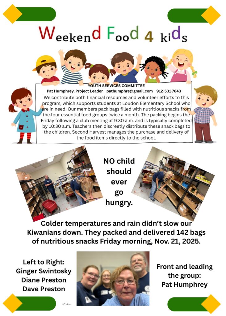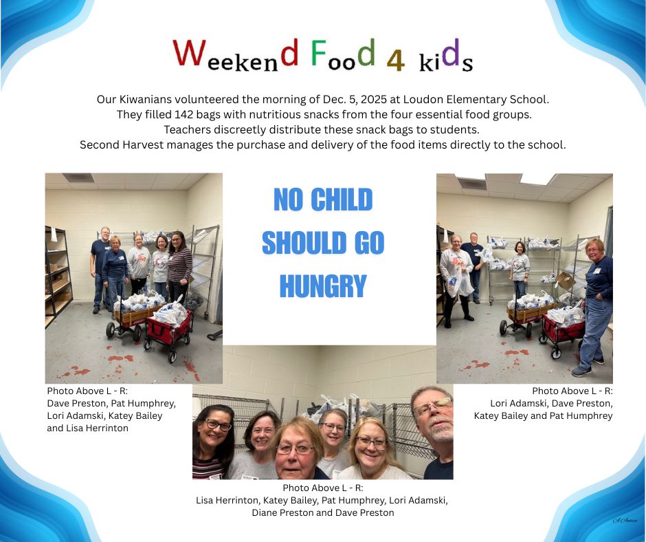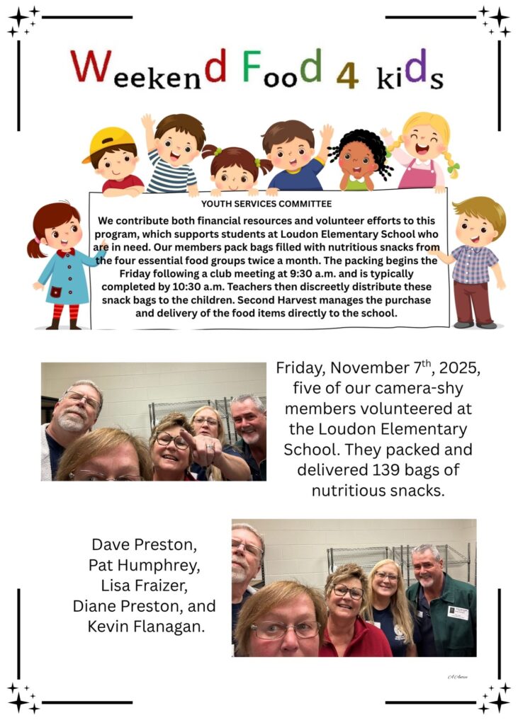 We contribute both financial resources and volunteer efforts to this program. It supports students at Loudon Elementary School who are in need. Our members pack bags filled with nutritious snacks from the four essential food groups twice a month. The packing begins the Friday following a club meeting at 9:30 a.m. and is typically completed by 10:30 a.m. Teachers then discreetly distribute these snack bags to the children. Second Harvest manages the purchase and delivery of the food items directly to the school.