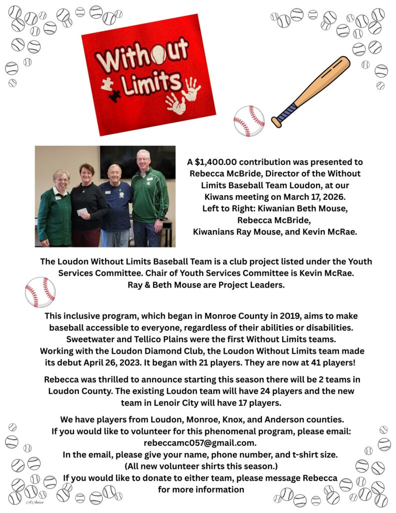 The Loudon Without Limits team made its debut April 26, 2023. The Loudon team consists of players ranging in age from 5 to 28. Our club provides monetary support, and members volunteer to support the athletes at their ball games. Tellico Village Kiwanis Club is proud to support the Loudon Without Limits Baseball Team!